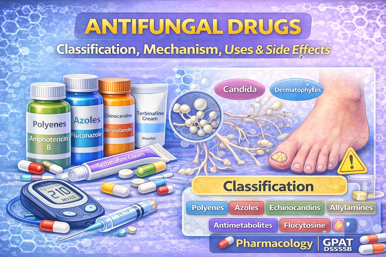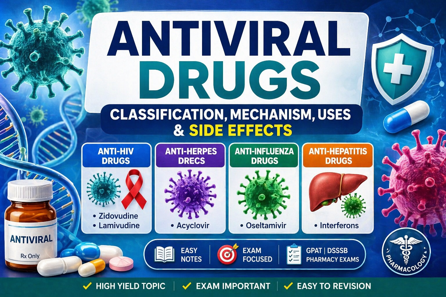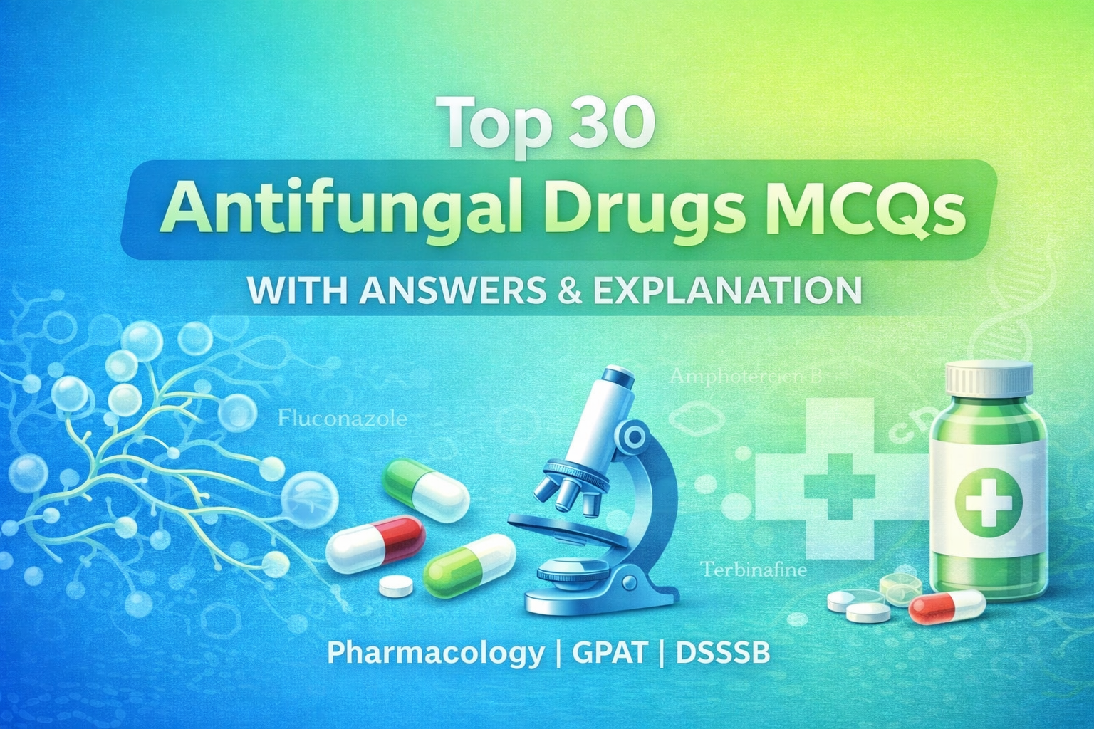 📌 Introduction Antiviral drugs are used to treat viral infections by inhibiting viral replication. This topic is very important for GPAT, DSSSB, and other pharmacy exams. These MCQs will help you revise key concepts quickly. 📝 MCQs on Antiviral Drugs 1. Viruses depend on: A) Bacteria B) Host cells C) Fungi D) Water ✔ Answer: … Read more