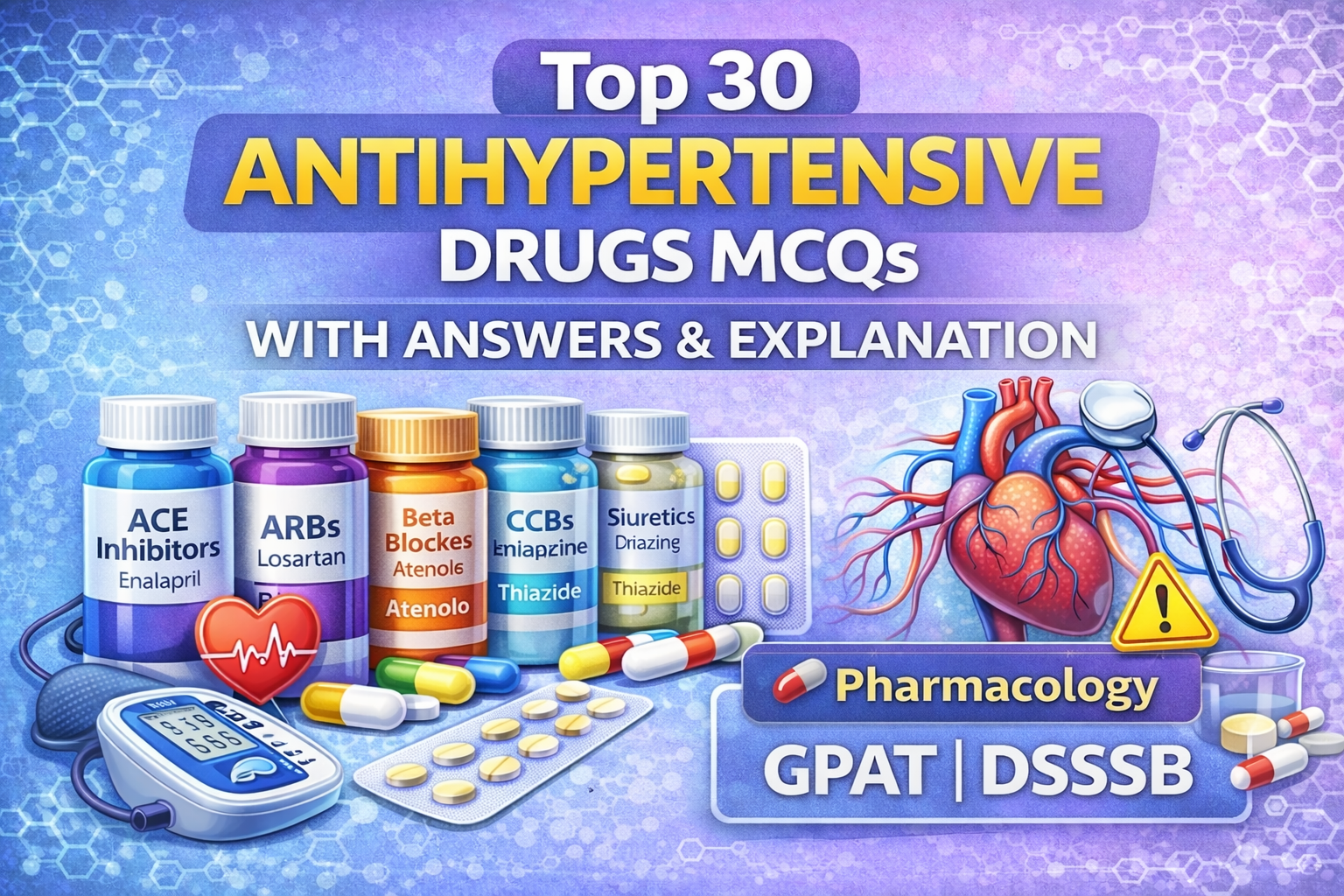 These 30 MCQs on antihypertensive drugs will help you revise important pharmacology concepts and improve your exam performance. Practice regularly for GPAT and DSSSB success.